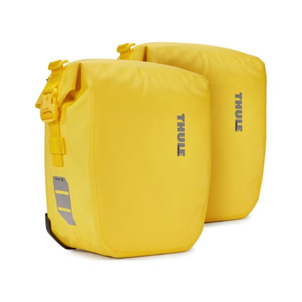 Thule PACK'N PEDALE Tasche "Shield Pannier Small" Paar, Volumen: 2x 13 l, Maße (L x B x H): 31 x 13 x 40cm, Gepäckträgermontage Benutzerfreundliches, sicheres und vibrationsfreies Befestigungssystem, verschiedene Tragevarianten durch integrierten Tragegriff und abnehmbare Schultergurte, mit Rollverschluss, Befestigungspunkte für Beleuchtung, Innentaschen zum Verstauen kleiner Gegenstände, Material: Nylon, wasserdicht, Reflexapplikationen vorne und an den Seiten, Gewicht: 2 kg pro Stück, passt auf alle Thule Träger, sowie auf nahezu alle anderen Gepäckträger