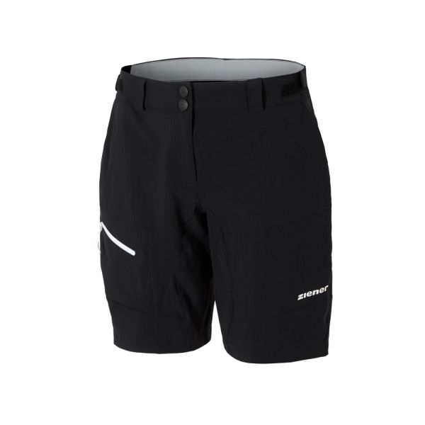 Lässige Damen Freeride Bike Shorts aus 4-Wege-Stretch und Reißverschluss Taschen. Die beiden vorderen Zip-Pockets bieten viel Stauraum und werden ergänzt durch die Reißverschlusstasche am Bein. Integriert ist eine herausnehmbare Biketight mit neuem antibakteriellem, nahtfrei verarbeitetem ZIENER Air Gel Sitzpolster mit perforierter Geleinlage an den Sitzknochen. Das anatomische Mehr-Lagen Sitzpolster ist luftdurchlässig und bietet optimale Dämpfung, gleichmäßige Druckverteilung und verhindert Taubheitsgefühle. Durch das innovative Wabensystem ist das Polster optimal belüftet und sorgt für ein trockenes und angenehmes Gefühl auf der Haut. Verstellbarer elastischer Hosenbund mit Klettverschluß, Gürtelschlaufen und Druckknöpfen. Der Einsatz von Quick Dry Gewebe sorgt für optimalen Feuchtigkeitstransport und schnelles Trocknen.